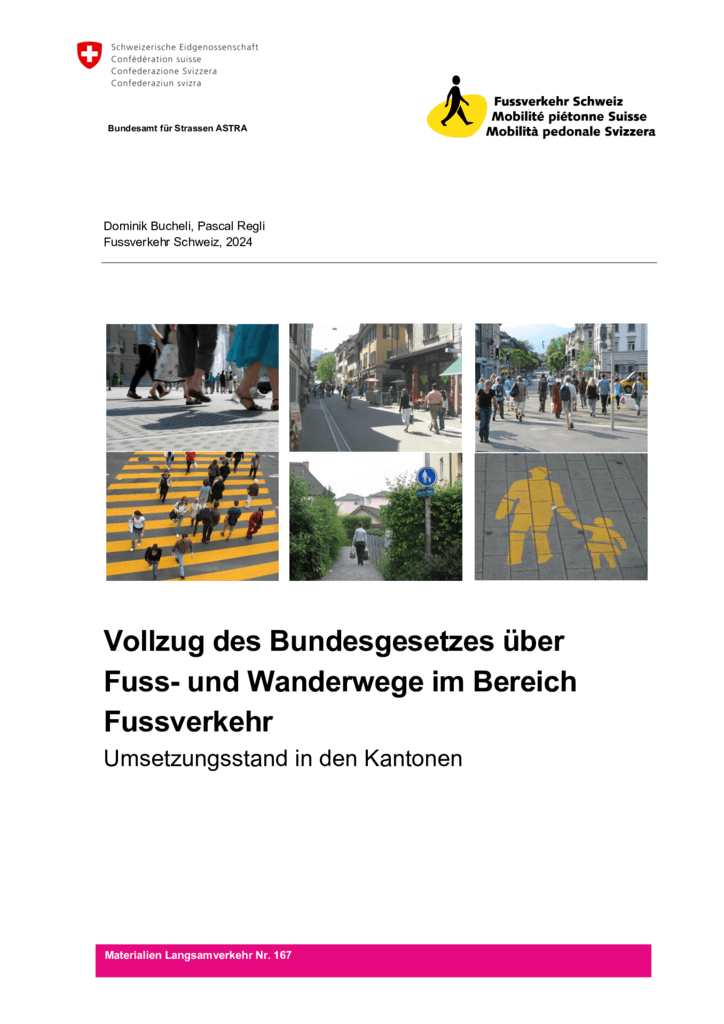 Fussverkehr Schweiz hat im Auftrag des ASTRA im Jahr 2023 und 2024 in einer Umfrage bei den kantonalen Fachstellen Fussverkehr den Stand der Umsetzung des Fuss- und Wanderweggesetzes (FWG) im Bereich des Fussverkehrs erhoben.